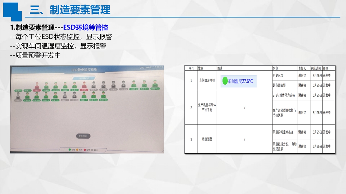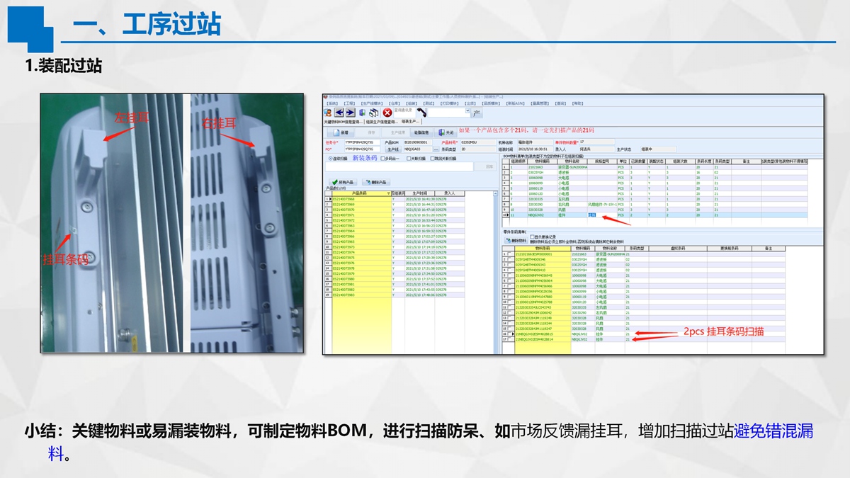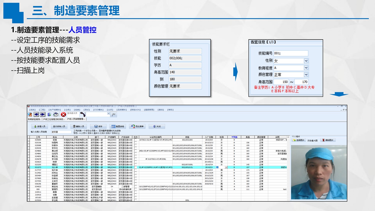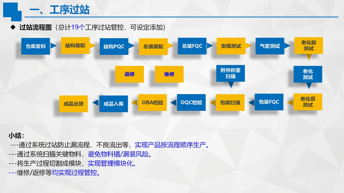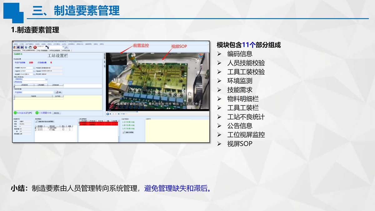 方便工厂制造人、机、料、法、环控制,针对产品可以设定工位要求,可对人员身高,视力、学历、技能进行二维码扫描上岗管控,对工位使用工具工装进行编码匹配和有效期校验,可对位物料进行编码提醒,不同产品物料编码进行比对告知,可监控ESD和温湿度,可自动统计不良,FQC产生不良可自动推送到本工位提醒。现场作业可进行录像监控,可追溯操作动作和加工时间,可播放电子档SOP和视频SOP,方便员工学习,可推送公告到工位,方便了解宣导事项,并可进行IT自动统计。