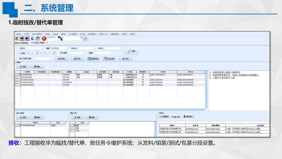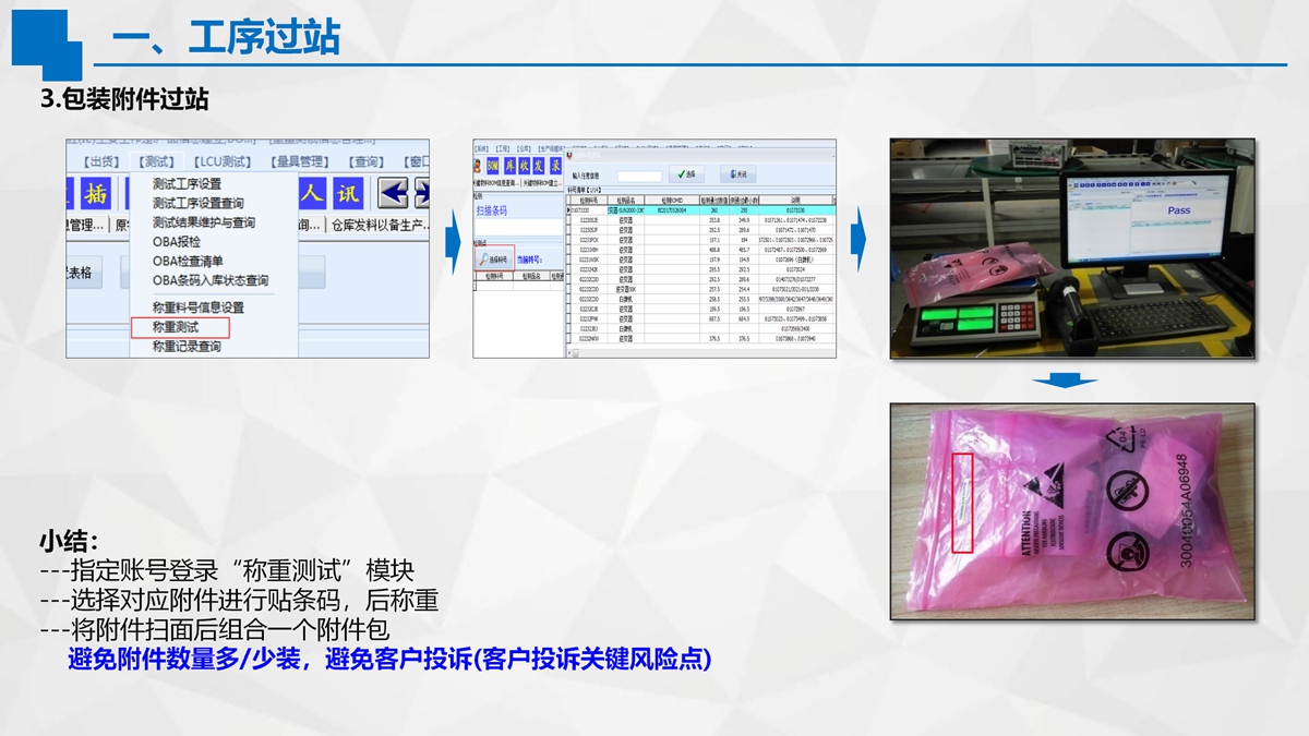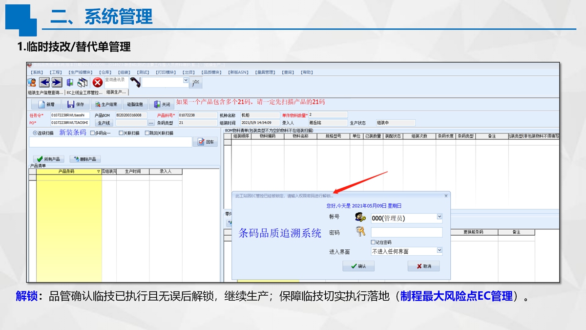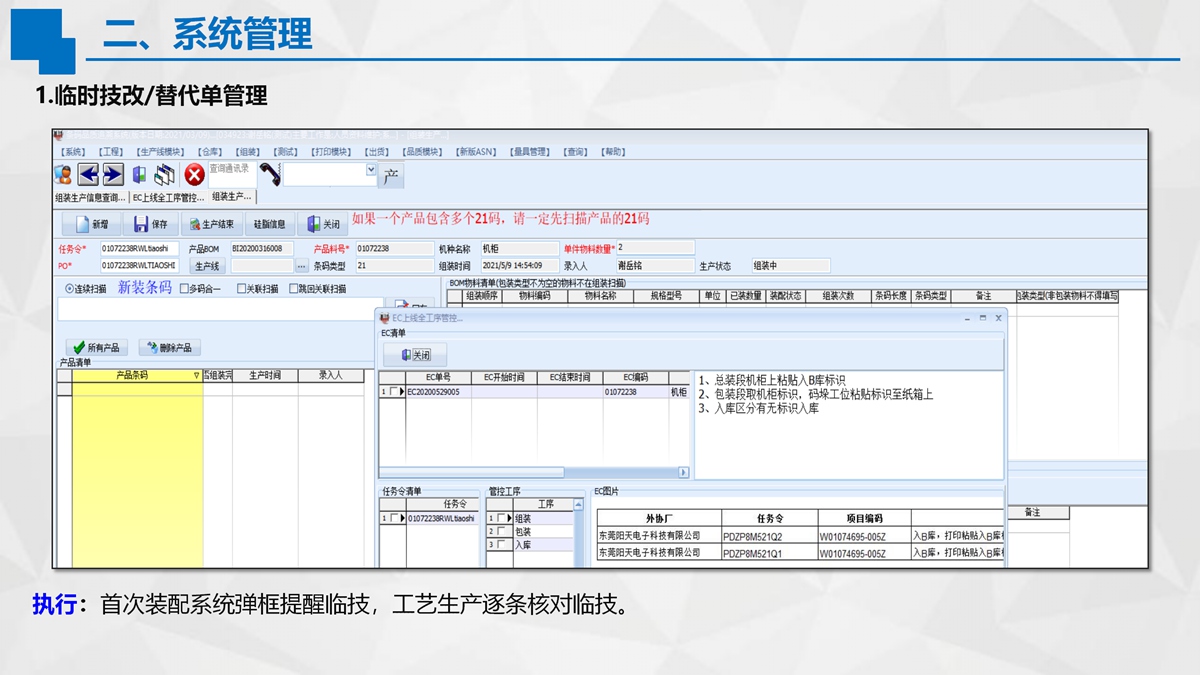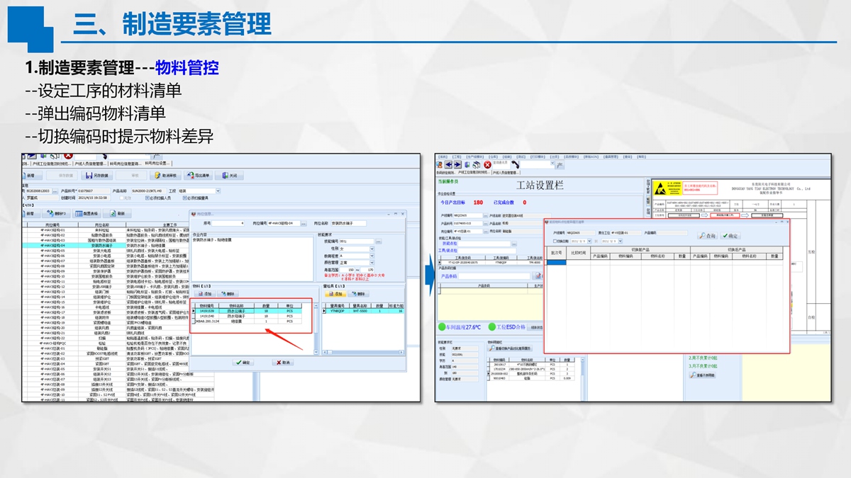 方便工厂制造人、机、料、法、环控制,针对产品可以设定工位要求,可对人员身高,视力、学历、技能进行二维码扫描上岗管控,对工位使用工具工装进行编码匹配和有效期校验,可对位物料进行编码提醒,不同产品物料编码进行比对告知,可监控ESD和温湿度,可自动统计不良,FQC产生不良可自动推送到本工位提醒。现场作业可进行录像监控,可追溯操作动作和加工时间,可播放电子档SOP和视频SOP,方便员工学习,可推送公告到工位,方便了解宣导事项,并可进行IT自动统计。